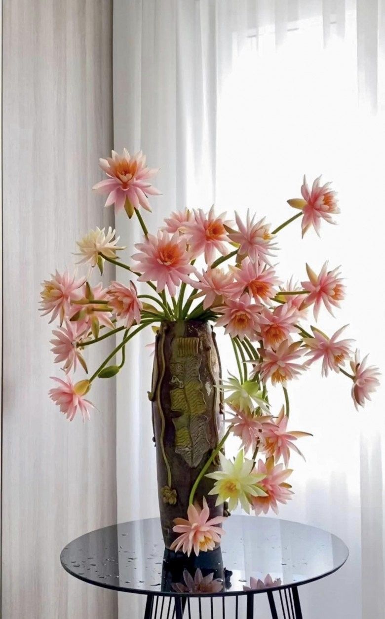 Bình hoa súng cá hồi múa lượn đẹp như tranh vẽ của chị Hà Lê.