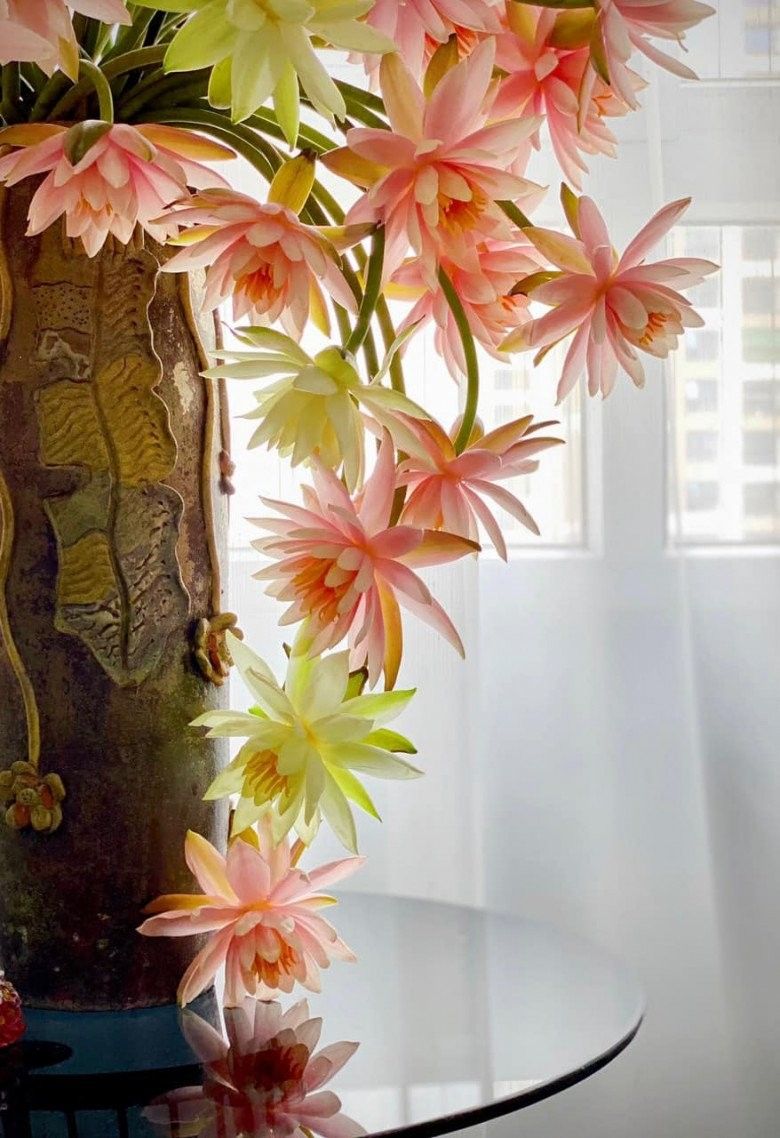 Mới đây, bình hoa súng cá hồi 40 bông của mẹ đảm Hà Nội tiếp tục "gây bão" với hội yêu hoa bởi vẻ đẹp dịu dàng nhưng không kém phần rực rỡ, đặc biệt mỗi bông hoa đều có độ cong khác nhau, tạo cảm giác như bình hoa đang múa lượn vũ khúc chào hè.