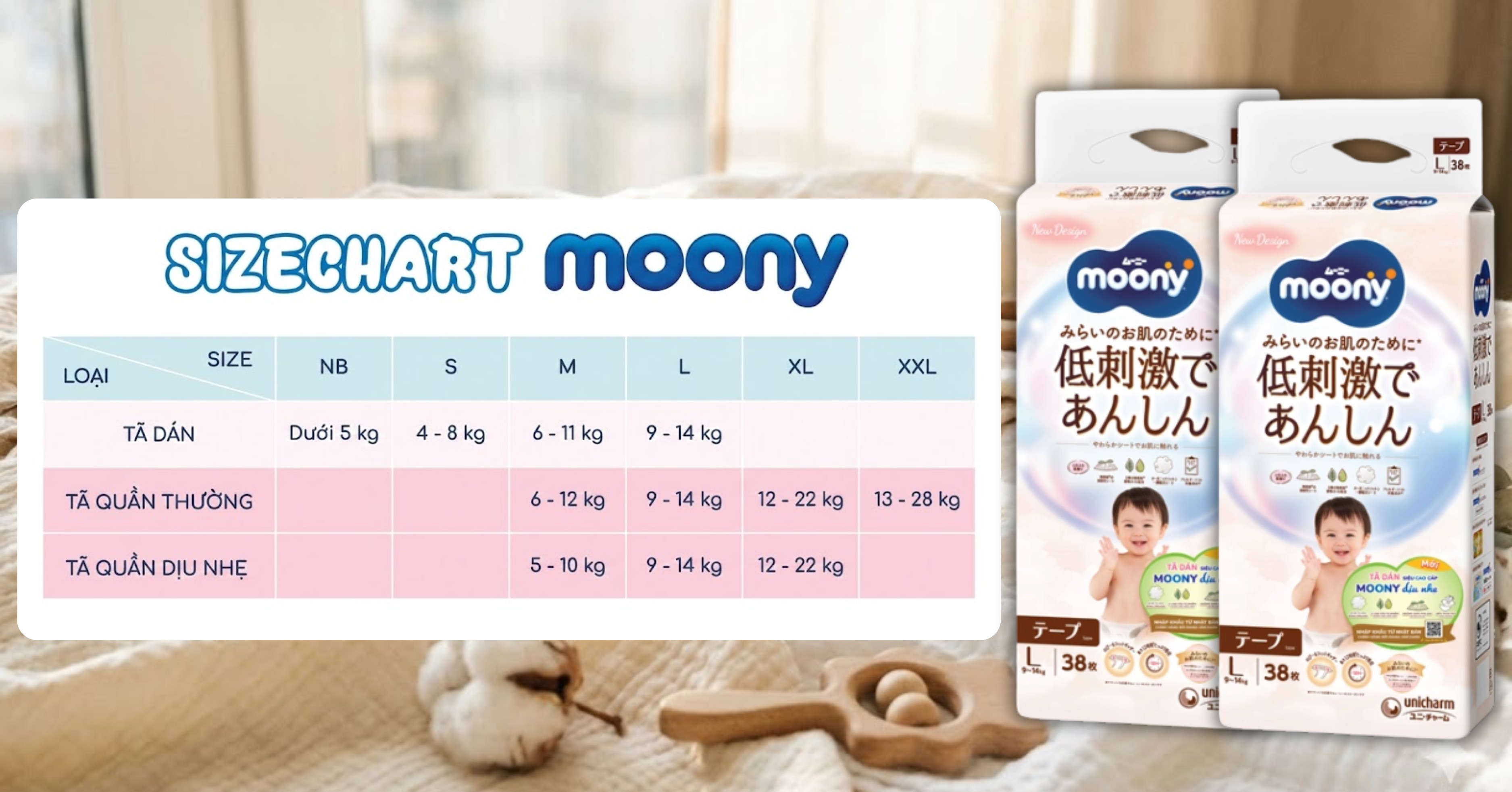 Dù mẹ chọn bỉm dán hay bỉm quần Moony, việc chọn đúng size bỉm là yếu tố quan trọng giúp bé luôn thoải mái, tránh các vấn đề như tràn lót, hằn đỏ hay kích ứng da. Mẹ nên chọn size bỉm dựa trên cân nặng thực tế của bé theo hướng dẫn trên bao bì sản phẩm.