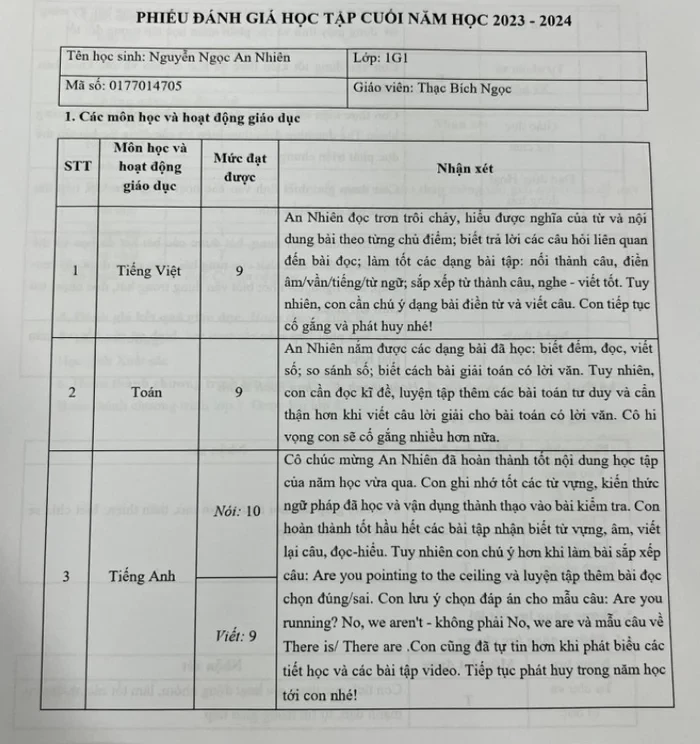 Theo bảng điểm, "con gái" Quỳnh Kool đạt điểm 9, 10 cho tất cả các môn học được chấm điểm, bao gồm Tiếng Việt, Toán, Tiếng Anh và Tin học.