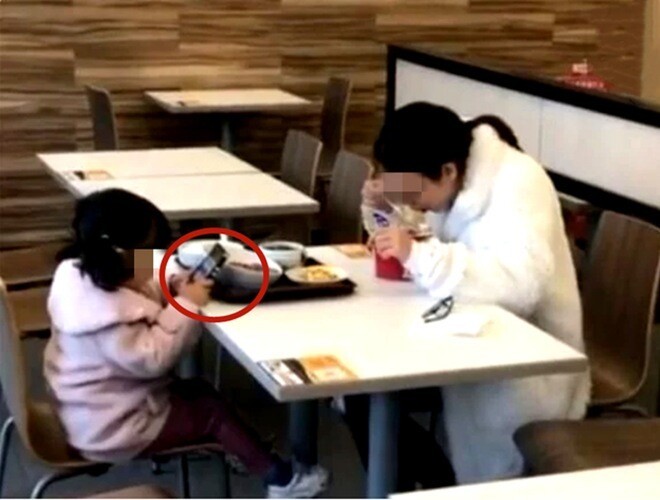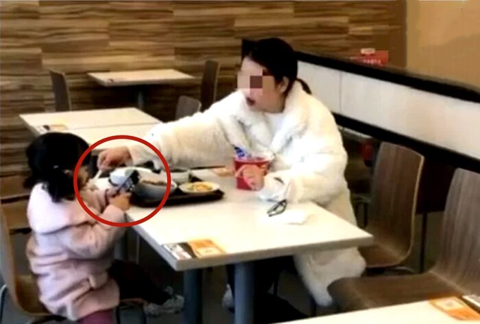Nhưng nhìn kỹ hơn, sẽ thấy cô bé khoảng 3-4 tuổi hoàn toàn không để ý đến đồ ăn. Bé chỉ cúi đầu mải miết chơi điện thoại, trong khi người mẹ vừa ăn mì gói vừa tiện tay đút cho con vì sợ con chỉ chơi mà quên ăn.