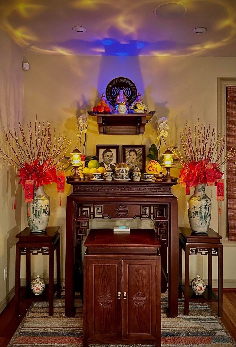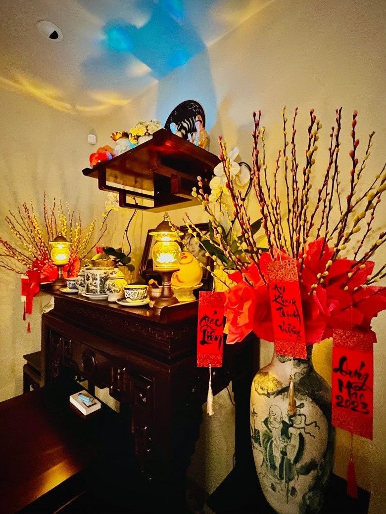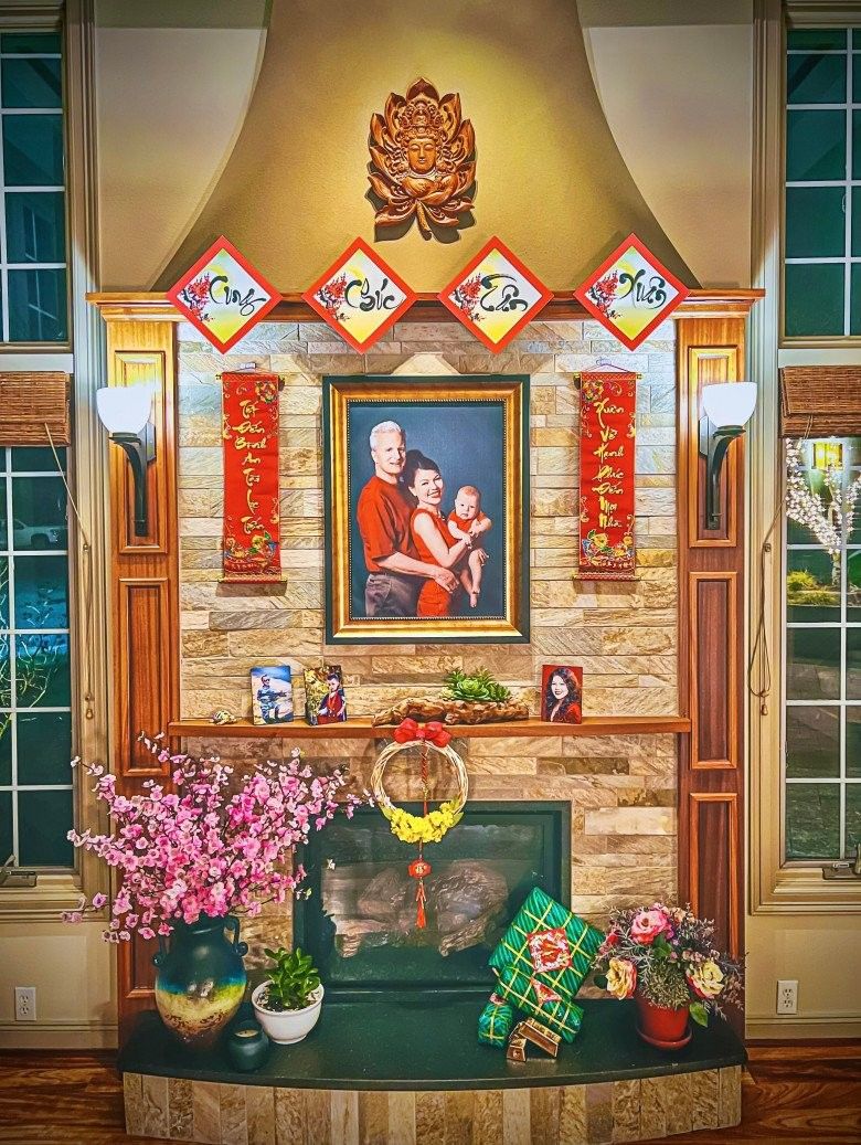 Tại góc thờ trang nghiêm, mẹ đảm chưng hoa rồi treo câu đối Tết. Câu đối là do chị tự lên mạng học cách viết thư pháp để treo trang trí Tết trong nhà. Nhìn không gian thờ tự trang nghiêm mà ấm cúng, dường như thấy được một góc Việt Nam giữa lòng nước Mỹ.