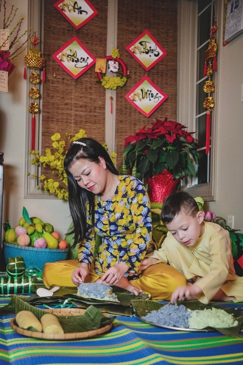 Dưới sự dạy dỗ của mẹ, con trai chị Kim Hiếu dù lớn lên ở Mỹ nhưng vẫn hiểu rõ và gắn bó với phong tục ngày Tết Việt Nam. Mẹ Việt cho biết: "Con trai mình năm nào cũng thấy Mẹ chuẩn bị Tết, nên bạn ấy đã rất thân thuộc. Năm nào mình cũng gói bánh tét, và giải thích cho bạn nghe về nguyên liệu làm bánh, kể bạn nghe ngày nhỏ mẹ cũng phụ ngoại làm bánh như bây giờ, nên bạn cũng hào hứng. Hôm trước lúc mẹ chuẩn bị gói bánh, bạn đi học về, thấy thì bạn hỏi: "Mommy, are you making bánh Tết? Can I help you?" (Mẹ ơi, mẹ đang làm bánh tét ạ? Để con giúp mẹ nhé? - PV). Mình vui lắm khi nghe con hỏi vậy, vì mình biết, định nghĩa về Tết của con đã hình thành trong tâm thức. Có bánh tét, có hoa, có áo dài, có lì xì là có Tết rồi".