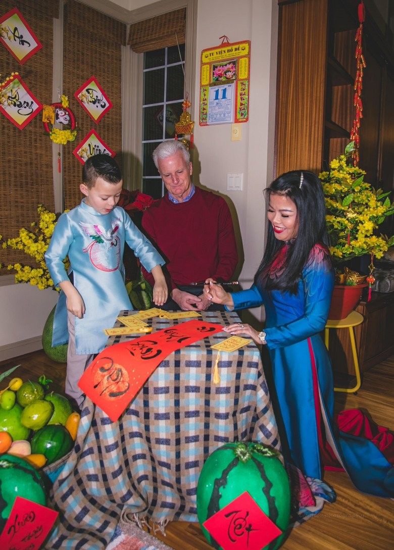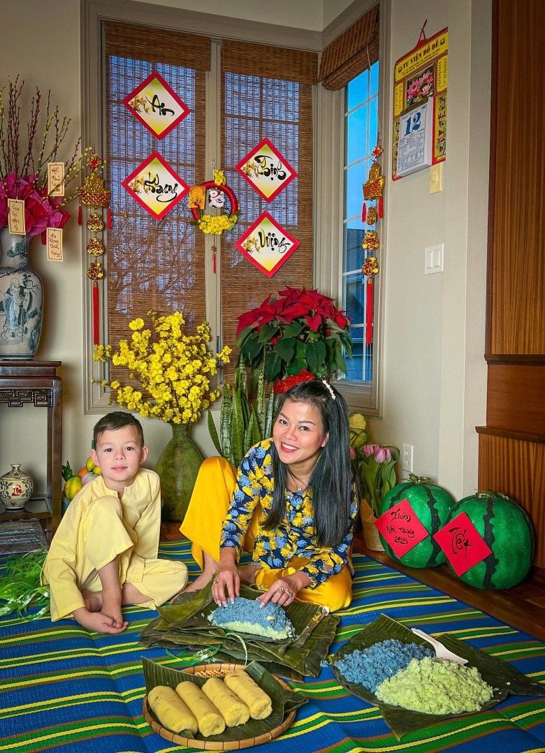 Nhưng sau đó thì năm nào mình cũng đón Tết theo truyền thống Việt Nam mình, một phần là cho mình đỡ nhớ, một phần là cho con. Trẻ con như một tờ giấy trắng, mình có thể vẽ lên đó cho con một tuổi thơ đẹp. Mình không thể dạy con về văn hoá Việt Nam nếu mình không thực hành nó. Khi bạn còn bé, đôi khi mình không cần dạy, những gì mình làm sẽ tự nhiên đi vào ý thức của con và trở thành ký ức rất tự nhiên".