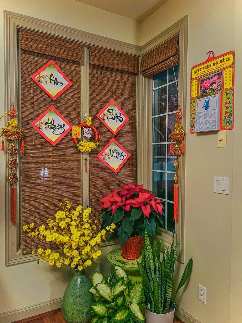 Năm nay Tết đến sớm, ngay sau Noel, chị Kim Hiếu đã bắt tay dọn dẹp và trang trí nhà đón Tết. Ngoài tự viết câu đối, mẹ đảm mua thêm đồ trang trí ở chợ Việt và mang một số món đồ từ Việt Nam qua như pháo, chậu mai, đèn lồng,... Còn lại chị tự tay làm trong 2 - 3 ngày, nên không quá tốn kém. "Khuôn viên căn nhà cũng không lớn lắm, khu vực phòng khách và phòng thờ gần bên nhau, mình trang trí 2 phòng này thôi, khi vừa bước vào nhà là đã thấy Tết, và thấy cả Việt Nam ở đó", mẹ đảm chia sẻ.