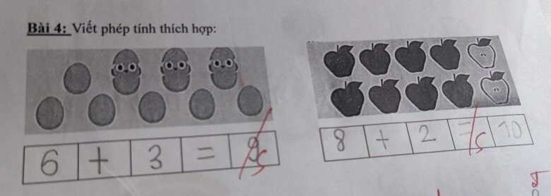 Tuy nhiên, mọi việc không chỉ đơn giản như thế bởi cô giáo đã chấm "Sai" dưới 2 phép tính này.