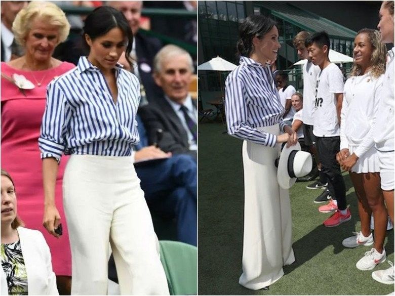 Đáng chú ý nhất ở bộ trang phục chính là chiếc quần ống rộng dài thượt của vợ Hoàng tử Harry. Thiết kế quần cạp cao với phần nhấn eo nổi bật lại còn sở hữu chiều dài quét đất không chỉ giúp tạo thắt eo mà còn kéo chân dài miên man. Đó là lí do mà ngay khi Meghan "lên sóng" với outfit này, chiếc quần của cô liền được hội chị em "săn lùng" ráo riết.