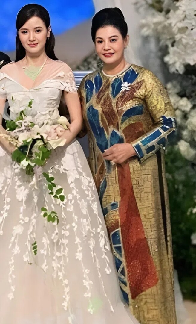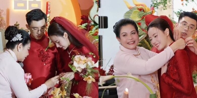 Trong lễ vu quy của con trai, phu nhân tập đoàn nhựa luôn tỏ ra trân trọng, yêu thương Midu. Bà nắm tay con dâu đi vào nhà, đôi mắt ngấn lệ hạnh phúc khi trao trang sức và chăm chú lắng nghe cặp đôi trao lời hẹn ước.