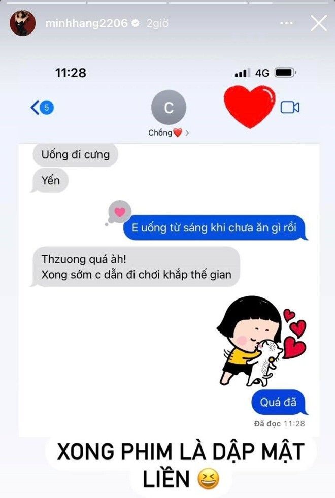 Biết vợ vất vả, anh dỗ dành: "Thương quá à, xong sớm chồng dẫn đi chơi khắp thế gian". Chụp màn hình đoạn tin nhắn qua lại với chồng, Minh Hằng vui vẻ khoe: "Xong phim là dập mật liền". Nhiều người cho rằng cô đang nóng lòng chờ tới khi xong công việc để tận hưởng chuyến trăng mật cùng ông xã.