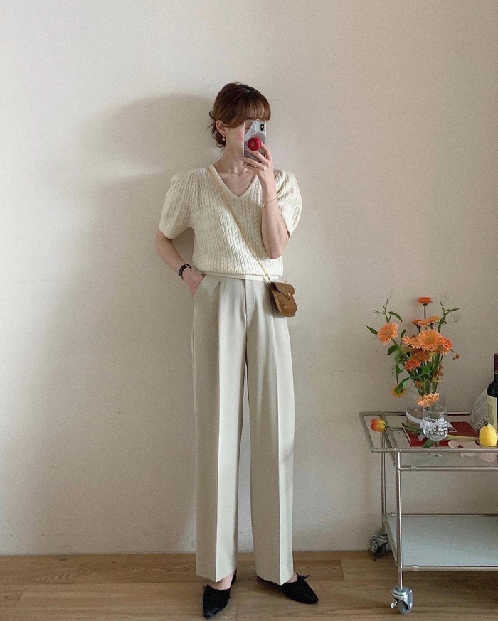 Khi phối cùng quần âu dáng suông hoặc ống đứng, set đồ không chỉ tạo cảm giác thoải mái mà còn giúp vóc dáng trở nên thanh thoát. Đây là công thức phù hợp cả khi đi làm lẫn gặp gỡ nhẹ nhàng.