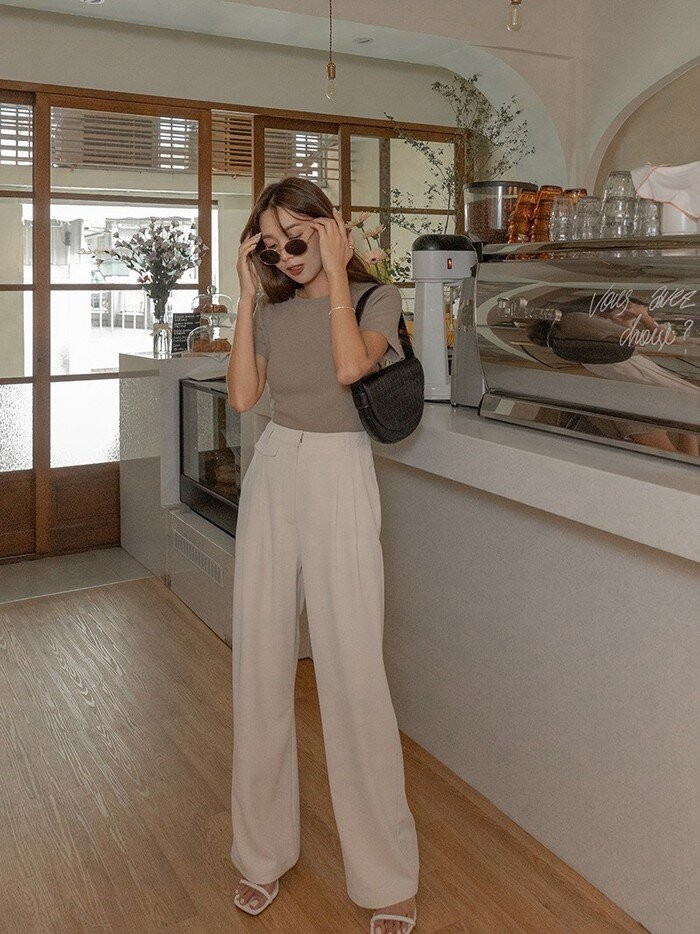 Áo thun phối cùng quần âu tạo nên outfit tối giản nhưng vẫn hiện đại. Nên chọn áo trơn, form vừa để giữ sự thanh lịch. Khi sơ vin gọn gàng, tổng thể trở nên chỉn chu hơn, phù hợp cả đi làm lẫn những buổi dạo phố nhẹ nhàng.