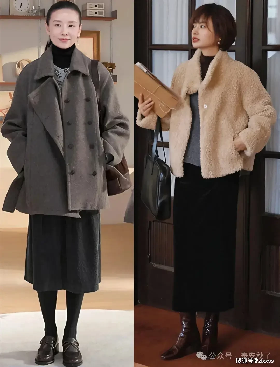 Với phụ nữ nhỏ nhắn, phần thân trên đầy đặn, áo khoác ngắn dáng rộng là lựa chọn lý tưởng. Kiểu áo này giúp “ăn gian” chiều dài đôi chân rõ rệt. Khi kết hợp cùng áo len đen ôm sát và chân váy đen cạp cao, bạn dễ dàng sở hữu diện mạo gọn gàng, thanh lịch và cực kỳ tôn dáng.