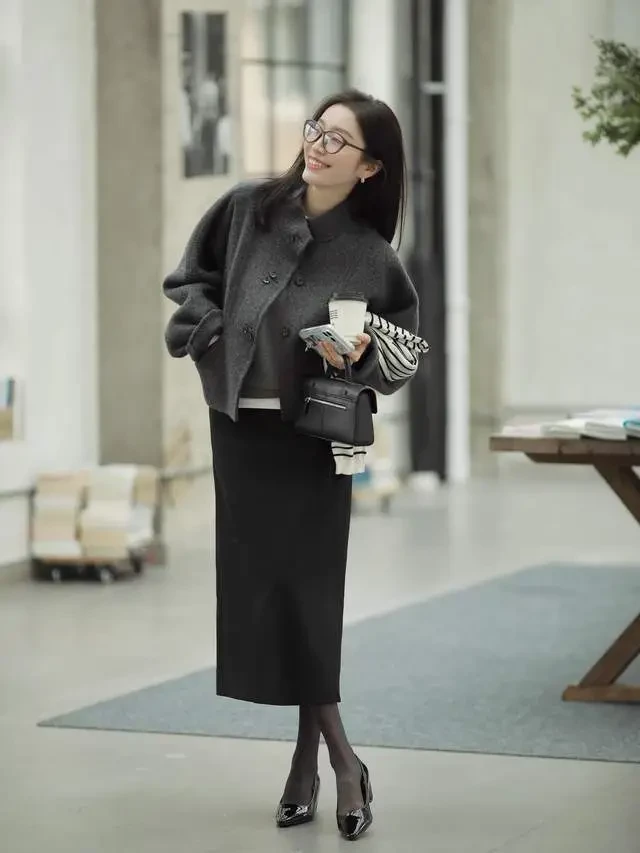 Áo khoác xám than phối cùng chân váy bút chì đen và tất đen tạo nên bảng màu trung tính đầy khí chất. Sự chuyển sắc từ xám sang đen giúp tổng thể không bị nặng nề khi đi làm đầu năm mới.