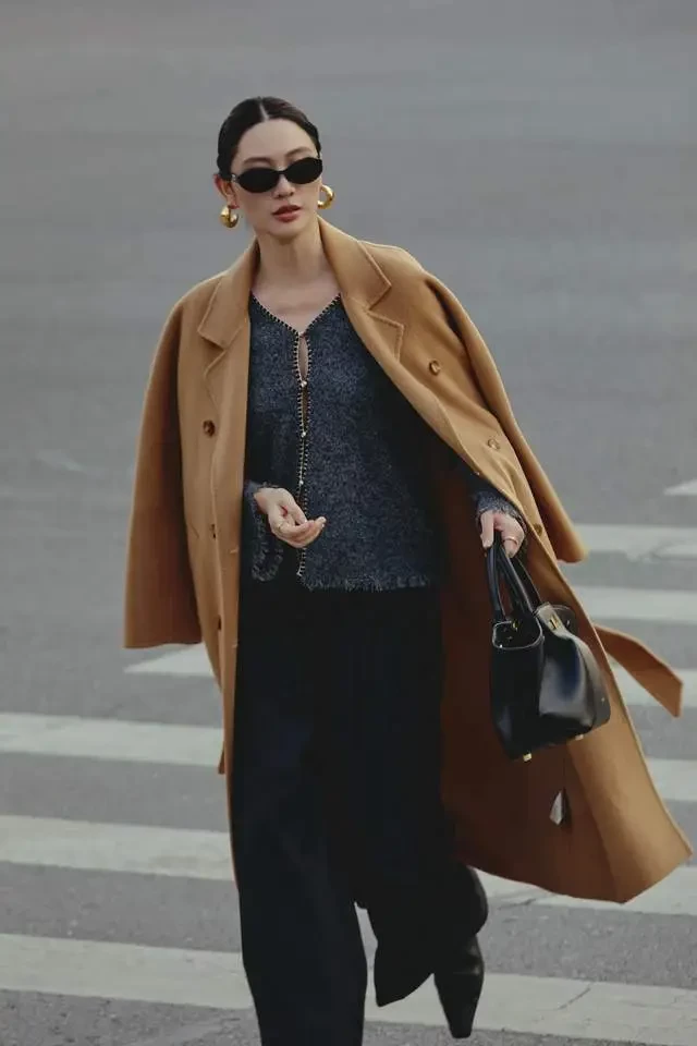 Áo khoác camel khoác hờ trên set đồ đen tạo nên tỷ lệ màu sắc hoàn hảo: ấm áp bên ngoài, tối giản bên trong. Nâu và đen là cặp đôi kinh điển, vừa quyền lực vừa thanh lịch. Phụ kiện vàng ánh kim nâng tầm tổng thể, mang lại cảm giác cao cấp mà không cần phô trương.