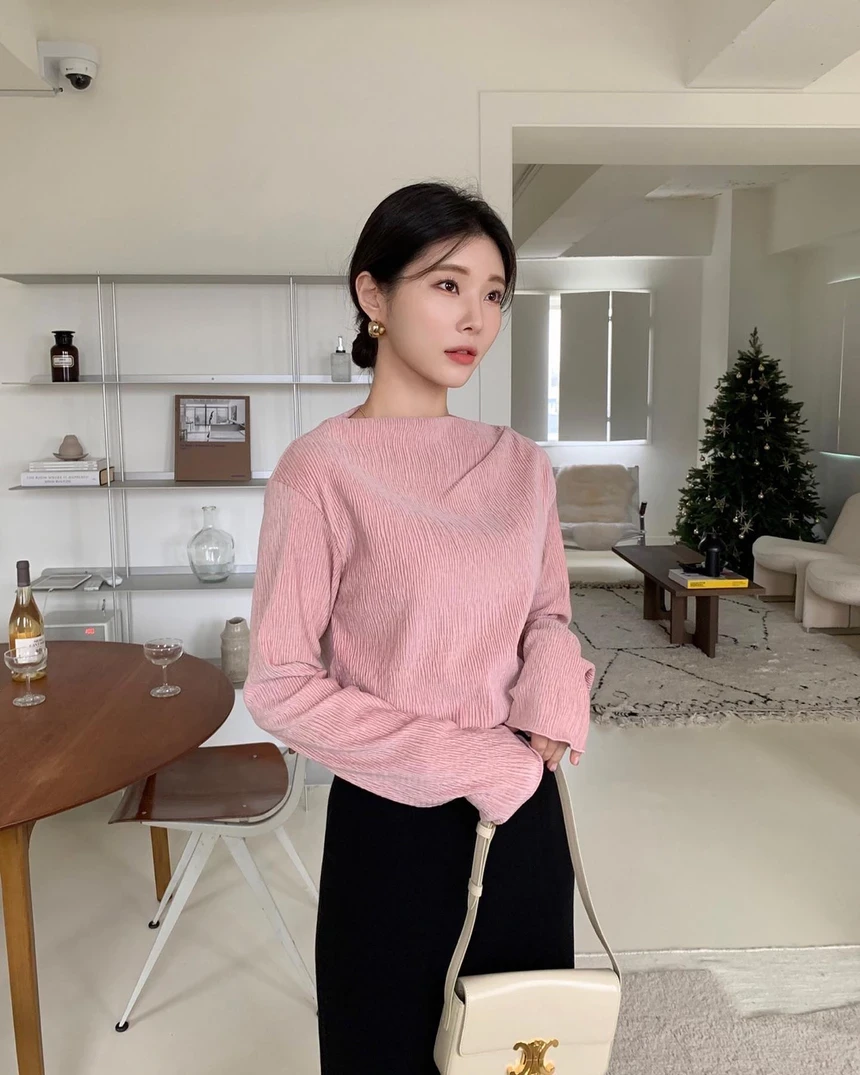Áo len hồng phấn đi cùng chân váy đen dài là công thức tương phản đầy hiệu quả. Sắc hồng làm dịu đi sự nghiêm túc của màu đen, trong khi đen lại giúp hồng trở nên trưởng thành hơn. Túi trắng kem hoàn thiện bảng màu theo hướng tối giản, hiện đại.