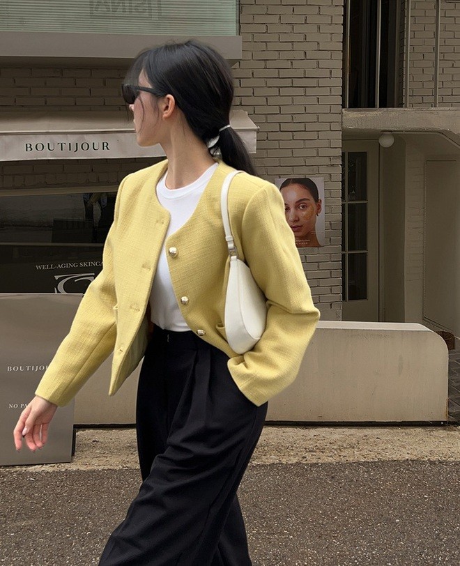 Áo khoác vàng pastel kết hợp cùng quần âu đen tạo nên sự đối lập bắt mắt nhưng tinh tế. Vàng bơ không quá rực, đủ để làm sáng gương mặt và tổng thể. Trắng được thêm vào ở áo trong và túi xách như một lớp đệm trung gian, giúp bảng màu trở nên hài hòa, dễ ứng dụng.
