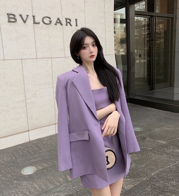 Bộ suit tím đồng bộ từ blazer đến váy ôm mang tinh thần power dressing đầy nữ tính. Sắc tím lavender tạo hiệu ứng vừa ngọt ngào vừa quyền lực, khác biệt hoàn toàn so với những gam trung tính quen thuộc nơi công sở. Phụ kiện tông nude giúp cân bằng thị giác, để màu tím thực sự trở thành tâm điểm.