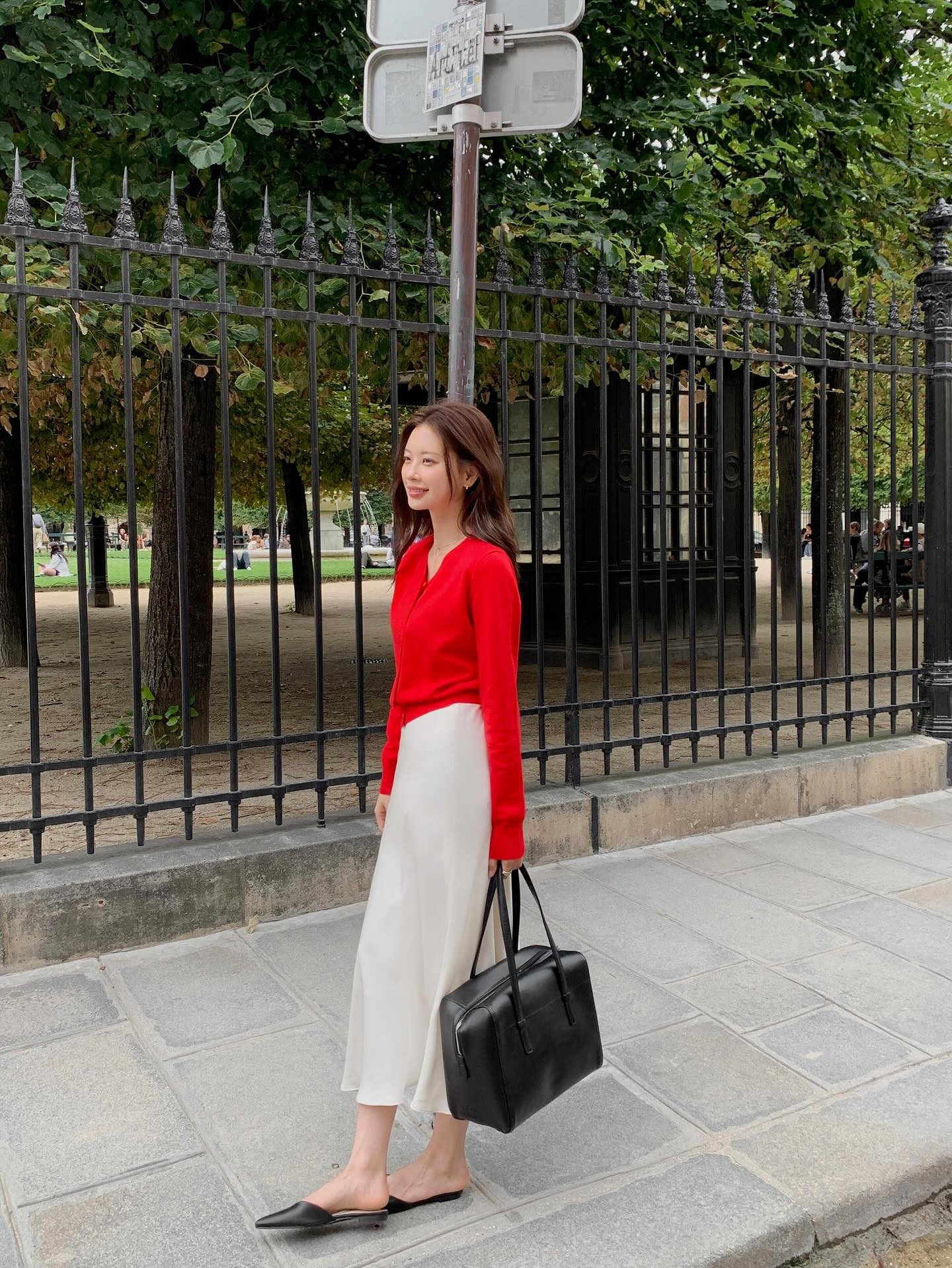 Để tránh cảm giác quá teen, nên chọn chân váy có độ dài vừa phải và phối cùng boots thấp cổ hoặc giày bệt mũi nhọn. Công thức này đặc biệt phù hợp cho những buổi du xuân, dạo phố, chụp ảnh đầu năm. Khi chọn cardigan màu sáng hoặc pastel, tổng thể trang phục sẽ trông hài hòa và rất đúng tinh thần Tết.
