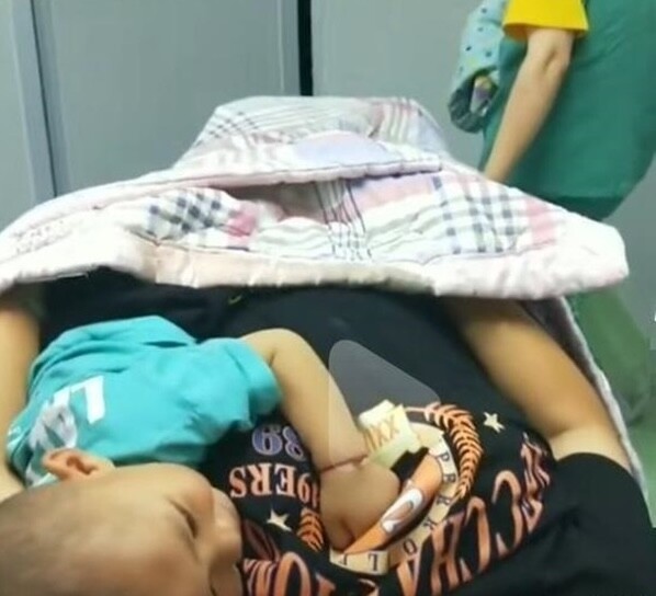 Trong bức hình là thời điểm hậu “vượt cạn” thành công, người mẹ được đưa ra khỏi phòng sinh, nằm trên giường đẩy, nhưng điều đặc biệt là cô đang ôm chặt đứa con trai lớn trong lòng. Còn em bé mới sinh thì được y tá hỗ trợ bế đi bên cạnh.