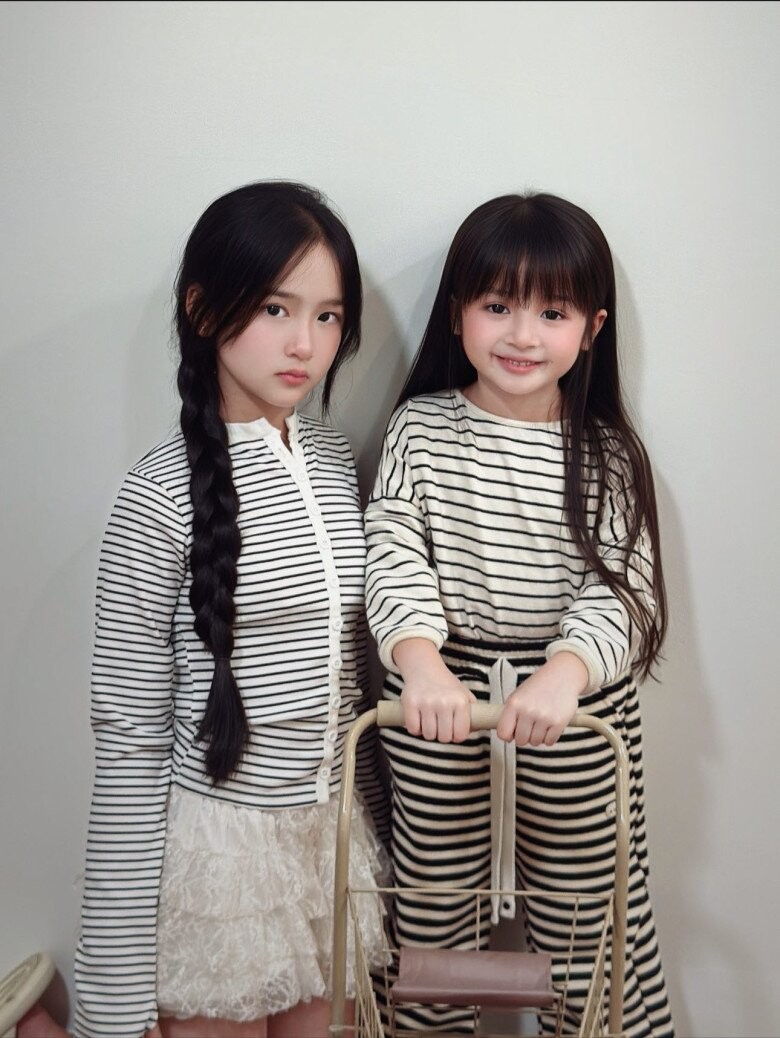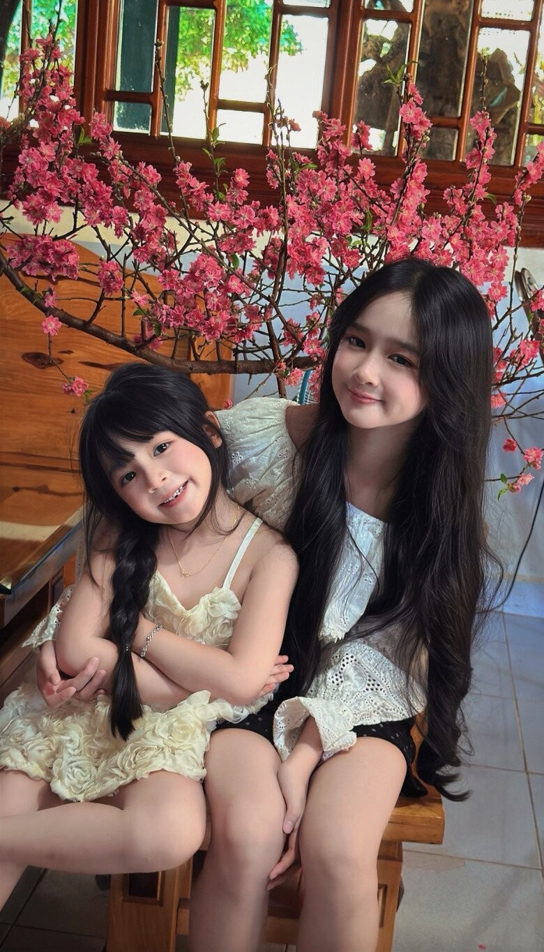 Hai bé Trâm Anh (11 tuổi) và Minh Anh (5 tuổi) từ nhỏ đã thu hút sự chú ý nhờ vẻ ngoài nổi bật. Cả hai đều sở hữu khuôn mặt thanh tú, đôi mắt to tròn, làn da hồng hào cùng nụ cười rạng rỡ. Mỗi khi xuất hiện, hai chị em dễ dàng “đốn tim” người đối diện bởi nét đáng yêu, lanh lợi và thần thái tự nhiên hiếm có. Không chỉ vậy, mái tóc dài đen mượt càng khiến các bé thêm phần nữ tính và cuốn hút.
