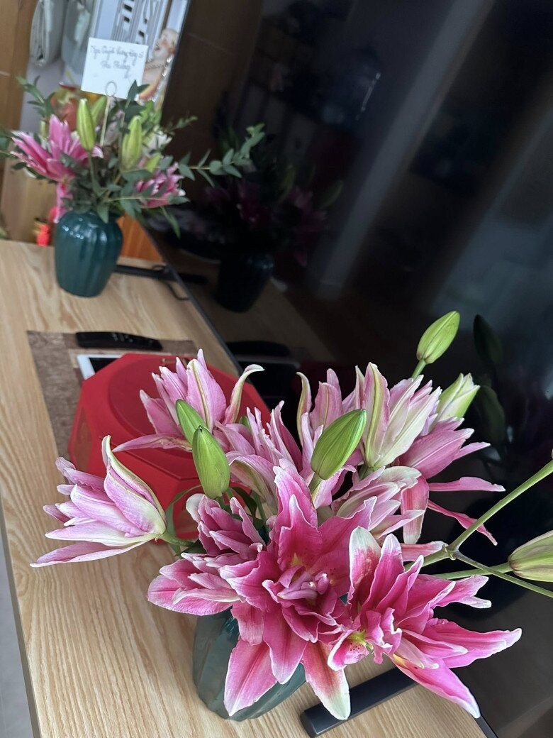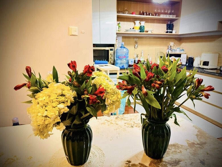 Bình hoa còn được thắt nơ xanh tinh tế, cách cắm tuy đơn giản nhưng chứa đựng tình cảm và tâm huyết của Thu Phượng, như một lời nhắc nhở nhẹ nhàng về vẻ đẹp của những điều giản đơn trong cuộc sống.