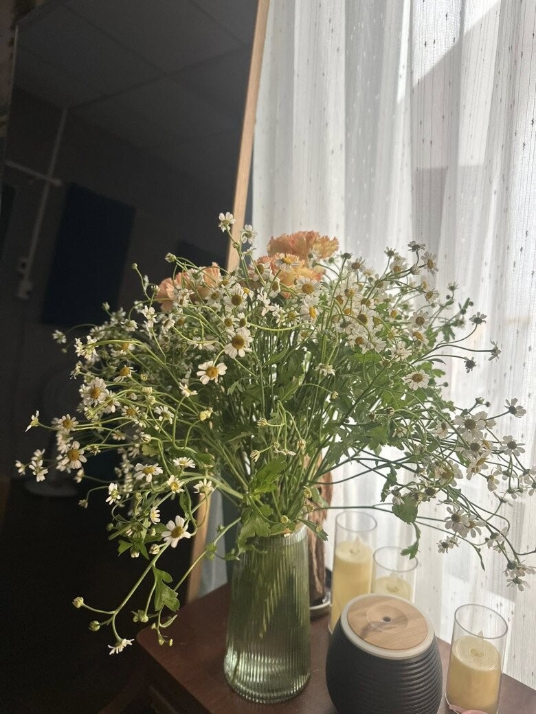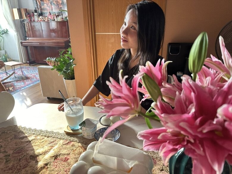 Góc làm việc bừng sáng với bình hoa cẩm chướng hồng phấn dịu dàng đan xen cùng những đóa cúc tana trắng muốt, tạo cảm giác thư thái và khơi nguồn cảm hứng sáng tạo cho nữ ca sĩ. Ánh sáng tự nhiên từ cửa sổ hắt vào làm tôn lên vẻ đẹp mong manh nhưng đầy sức sống của loài hoa đặc trưng của mùa thu.