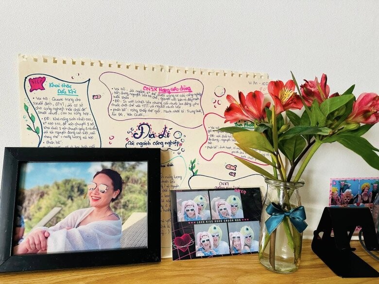 Góc học tập và kỷ niệm của gia đình thêm phần sống động nhờ lọ thủy tinh nhỏ nhắn cắm những cành hoa đơn giản nhưng đầy sức sống. Bên cạnh những bức ảnh ghi lại khoảnh khắc hạnh phúc, đóa hoa như một lời nhắc nhở nhẹ nhàng về vẻ đẹp của những điều giản đơn hiện hữu trong cuộc sống thường nhật.