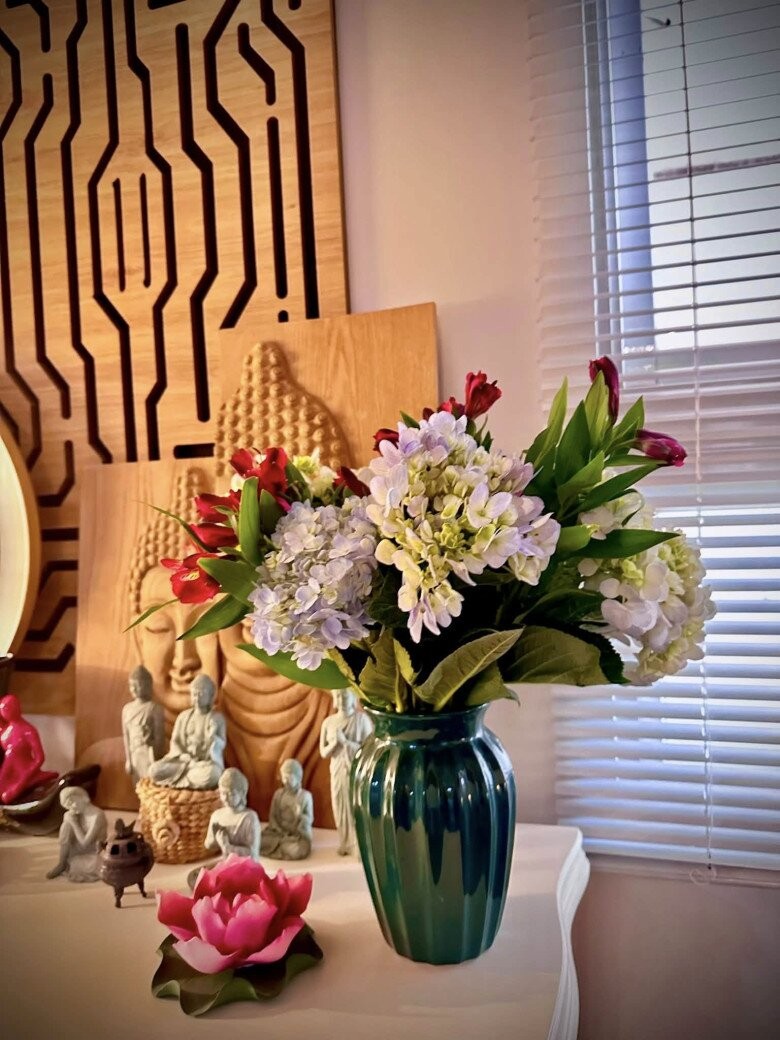 Bản giao hưởng màu sắc đan xen giữa sắc tím nhạt thanh tao của cẩm tú cầu và đỏ sẫm của thủy tiên, tạo nên một góc nhìn đa chiều đầy lôi cuốn. Đặt cạnh những món đồ trang trí mang phong cách thiền định, bình hoa giúp cân bằng cảm xúc và mang lại sự thư thái tối đa cho chủ nhân sau những giờ làm việc.