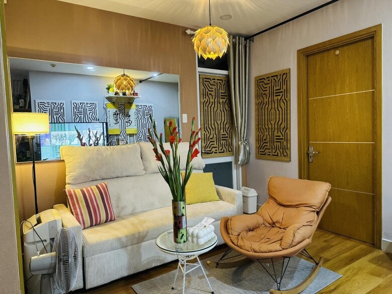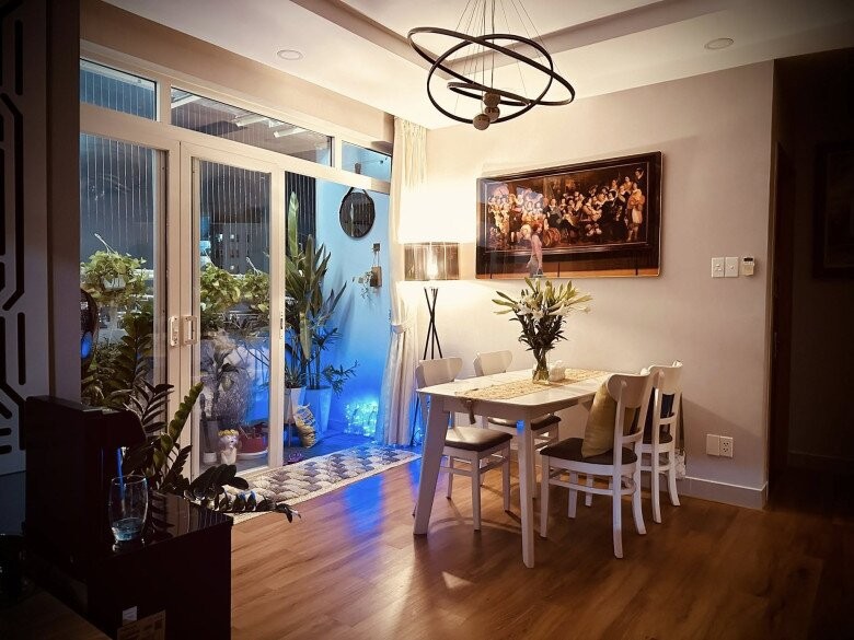 Dưới ánh đèn chùm nghệ thuật và không gian nội thất gỗ, đóa hoa vươn cao kiêu sa, góp phần khẳng định phong cách sống đầy chất thơ của chủ nhân căn hộ.