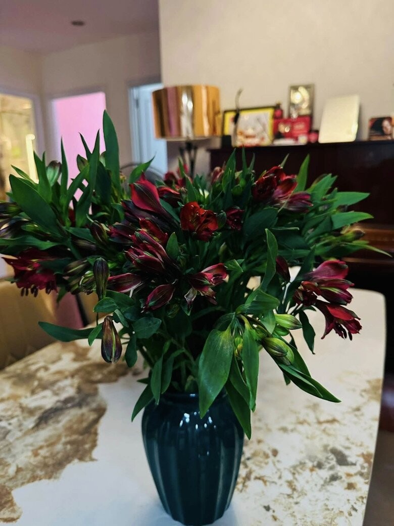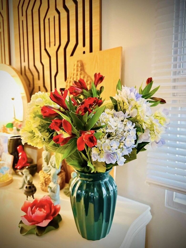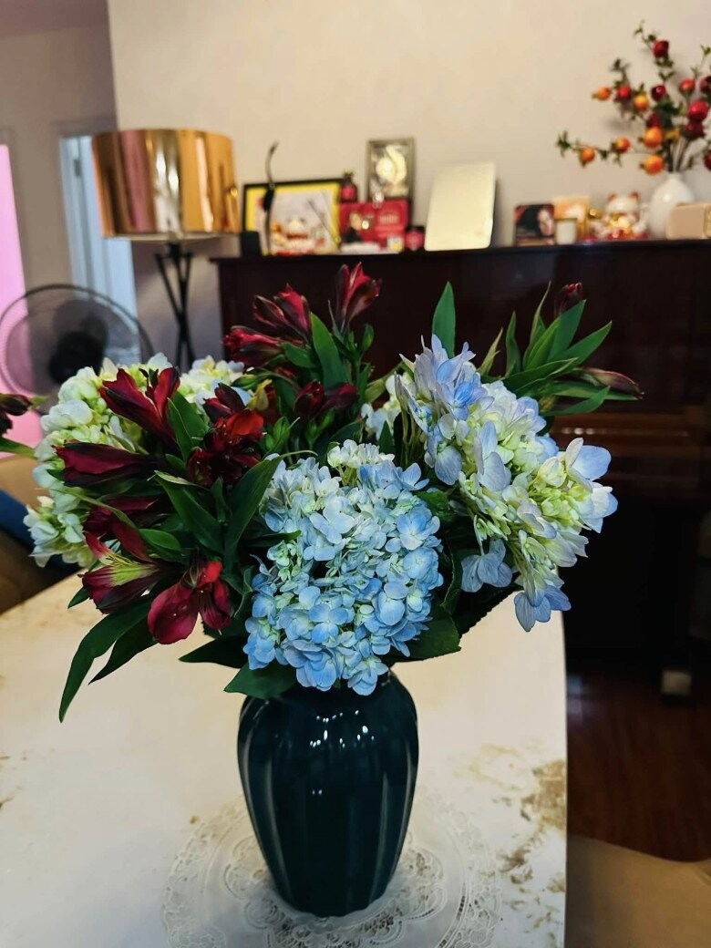 Trên mặt bàn đá cẩm thạch trắng, bình hoa khoe sắc đầy kiêu hãnh với những đóa cẩm tú cầu nở rộ như những quả cầu tuyết xanh nhạt, điểm xuyết bằng sắc đỏ rượu vang quý phái. Bình hoa cùng cách bài trí nhà cửa của Thu Phượng gợi lên một cảm giác bình yên đến lạ kỳ.