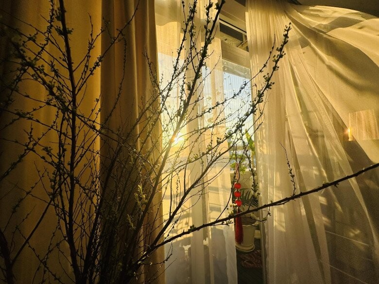 Mẹ bé Zon luôn cập nhật những bình hoa theo mùa. Dưới ánh nắng vàng vọt len lỏi qua lớp rèm voan mỏng, những nhành hoa xuân thanh mảnh vươn mình đón nắng mai, tạo nên khung cảnh nên thơ và tĩnh lặng.