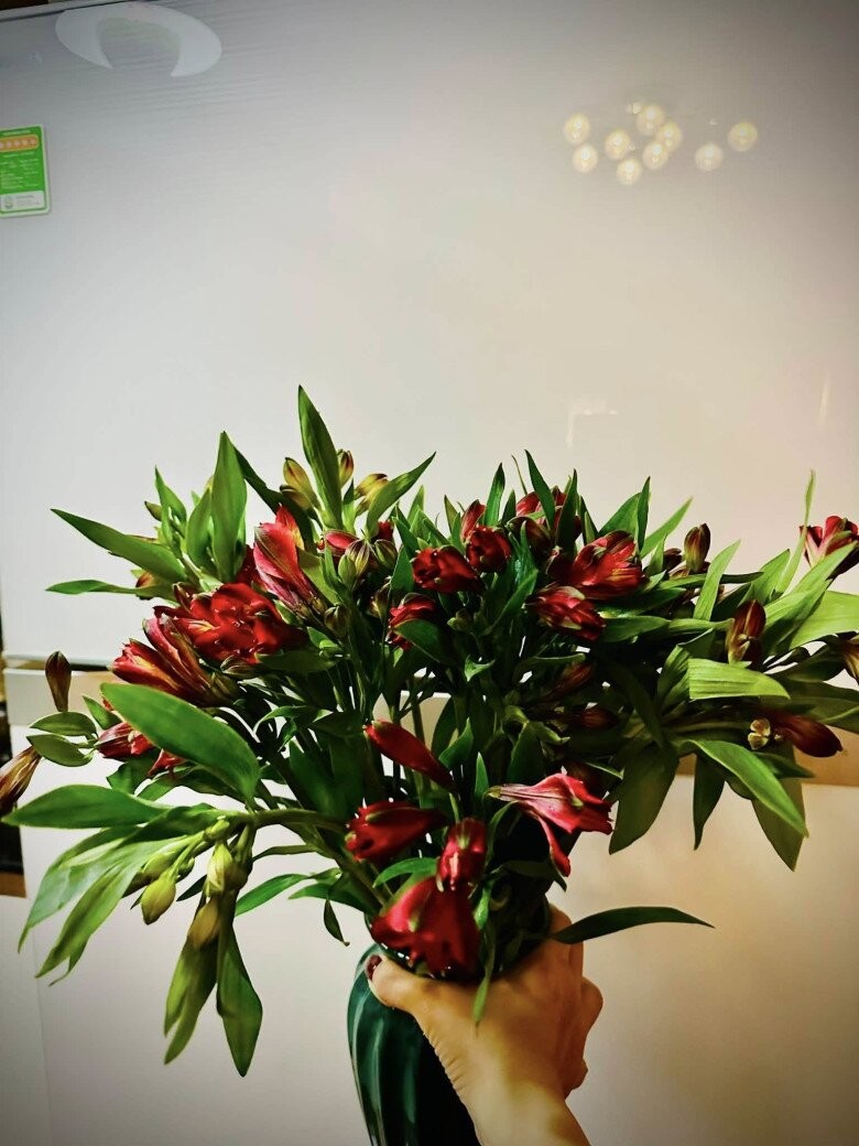 Có thể thấy sự ưu ái của Thu Phượng dành cho loài hoa thủy tiên đỏ - biểu tượng của sự nồng nhiệt và gắn kết bền lâu. Lối cắm hoa tự do, không gò bó giúp các cành hoa tỏa đều tự nhiên, vừa che lấp miệng bình gốm tinh xảo vừa tạo độ bồng bềnh, mềm mại cho góc trưng bày.
