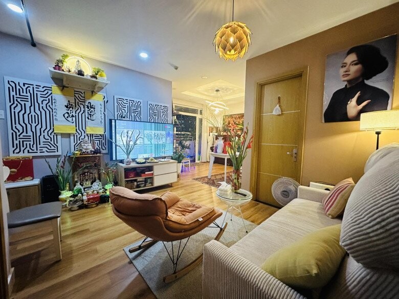 Thu Phượng sở hữu nhiều căn hộ, nơi nào cũng được cô dành nhiều tâm huyết trang trí. Không gian phòng khách hiện đại được thắp sáng bởi bình hoa ly trắng thanh khiết đặt ngay ngắn tại trung tâm bàn trà.