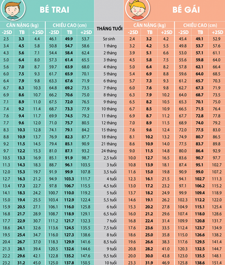 Bảng chiều cao - cân nặng chuẩn theo WHO.