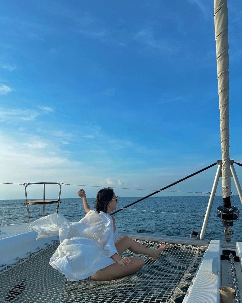 Băng Di khoe dáng với bikini màu trắng phối cùng áo choàng lụa xa xỉ đậm chất giới thượng lưu khi đi trên du thuyền ở biển.