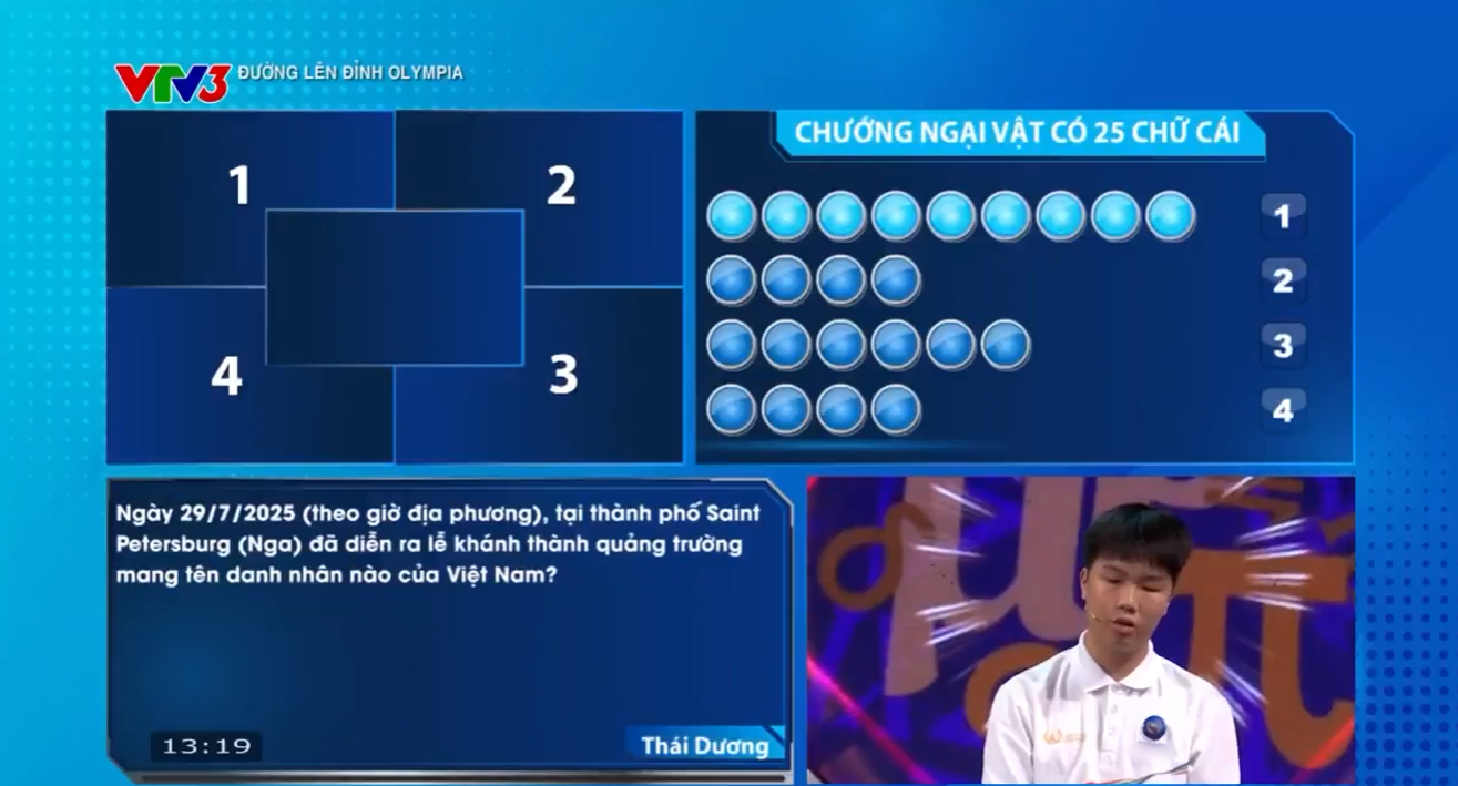 Đúng 13h ngày 26/4, cuộc thi quý 2 Đường lên đỉnh Olympia 2026 đã diễn ra với màn so tài kịch tính của 4 nhà leo núi xuất sắc nhất: Đoàn Trí Anh (THPT Đan Phượng - Hà Nội), Lý Thái Dương (THPT chuyên Hùng Vương - Phú Thọ), Trần Nguyên Đức (THPT Chuyên Khoa học Tự nhiên - Hà Nội) và Nguyễn Sư Minh Khôi (THPT Đông Hà - Quảng Trị).