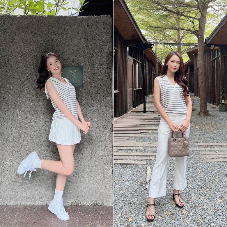 Mới đây, cô nàng mới "lên đồ" đi ăn nhà hàng Nhật với nguyên set "xì tin" là chân váy tennis và áo thủy thủ kẻ sọc ngang. Item áo tới từ Dior này trước đó đã từng được người đẹp mix với quần ống loe dáng lửng, xách túi cùng thương hiệu.