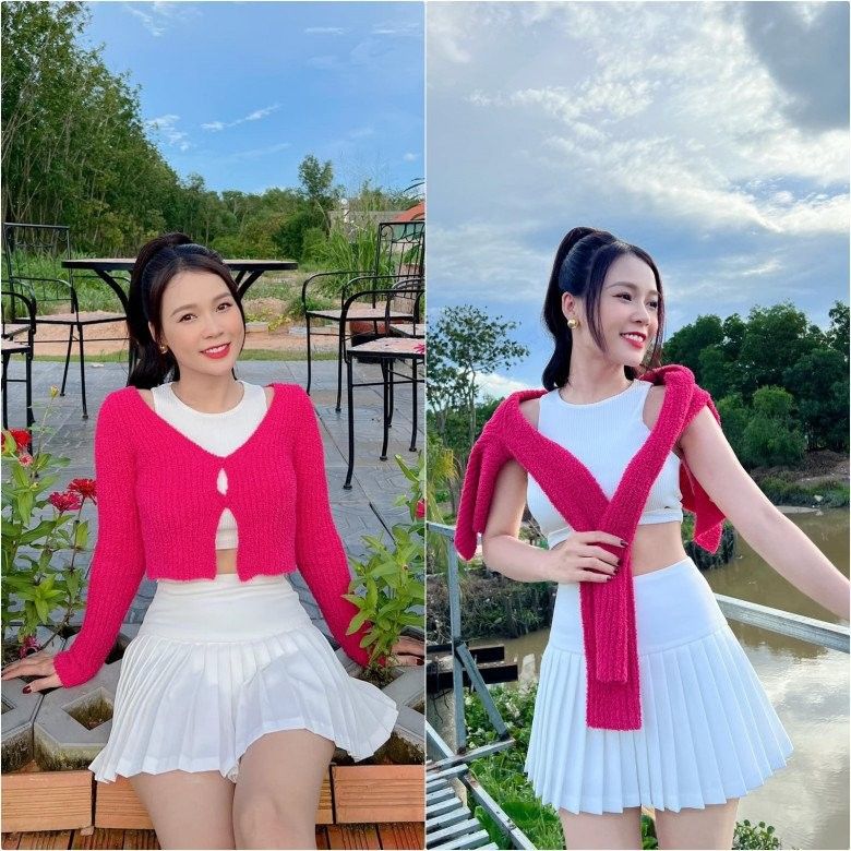 Cũng là chiếc chân váy màu trắng xinh xắn đó cô lại mix & match với áo croptop và khoác chiếc áo len xù dáng lửng. Combo mặc còn được biến tấu thành 2 kiểu khác nhau vô cùng bắt mắt.