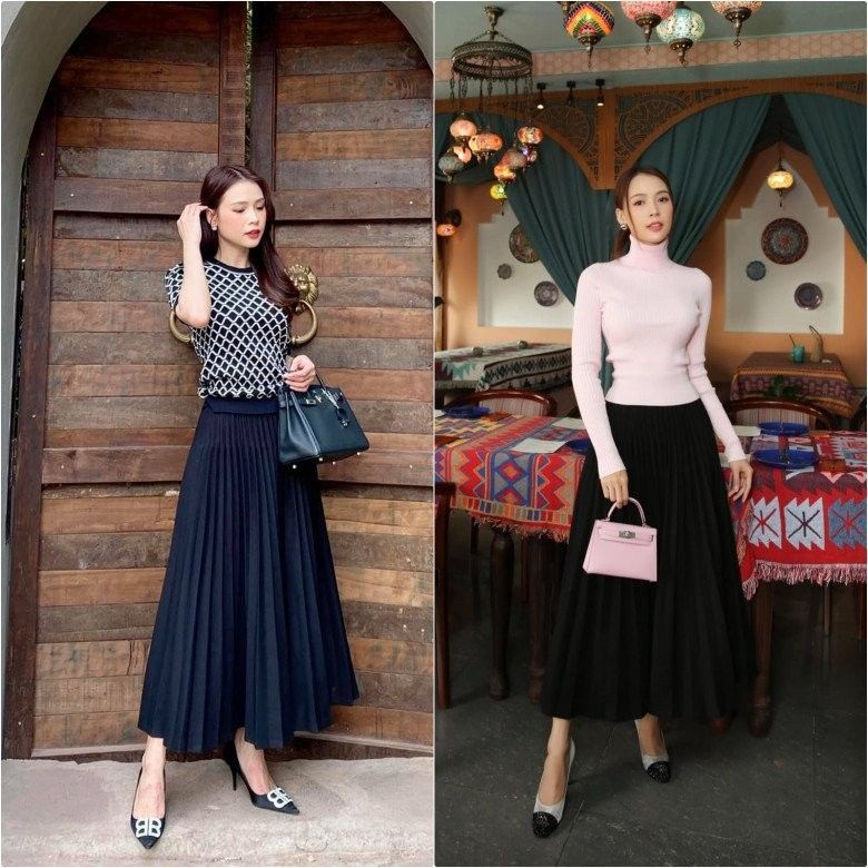 Với đồ công sở, nếu được chọn 1 món mặc được nhiều nhất chắc chắn là chân váy midi dáng xòe. Với thiết kế màu đen, cô nàng mix với gam màu sắc nào cũng sang xịn tuyệt đối.