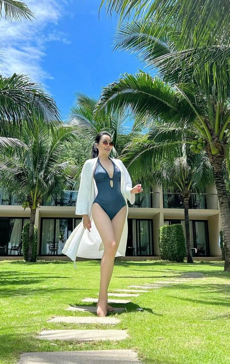Cô thả dáng ngọc ngà khoe đôi chân dài nuột nà và săn chắc trong bộ đồ tắm tinh tế.
