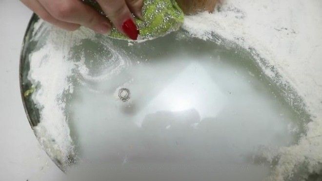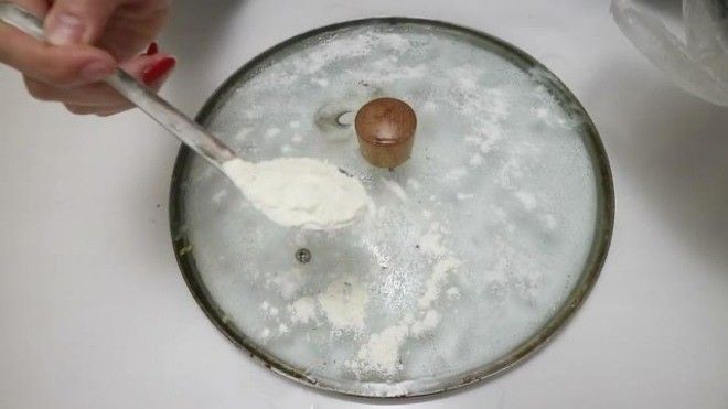 - Sau đó lấy bột mì chúng ta thường dùng ở nhà ra, chúng ta rải đều bột mì này lên nắp nồi, có thể rải một ít, để bột trải trên nắp nồi này trong 15 phút, loại bột này có đặc tính hấp thụ mạnh. Để lên trên nắp nồi có thể hấp thụ nhiều vết dầu và bụi trên nắp nồi vào bột, làm cho nắp nồi rất sạch sẽ.