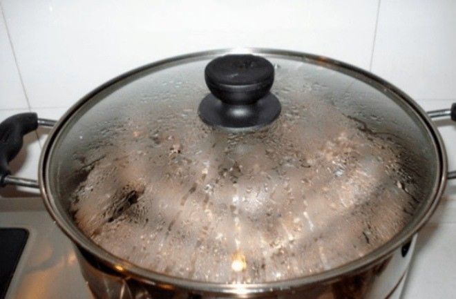 - Trước tiên chúng ta có thể đổ một ít nước lên nắp nồi để làm ẩm nắp nồi.