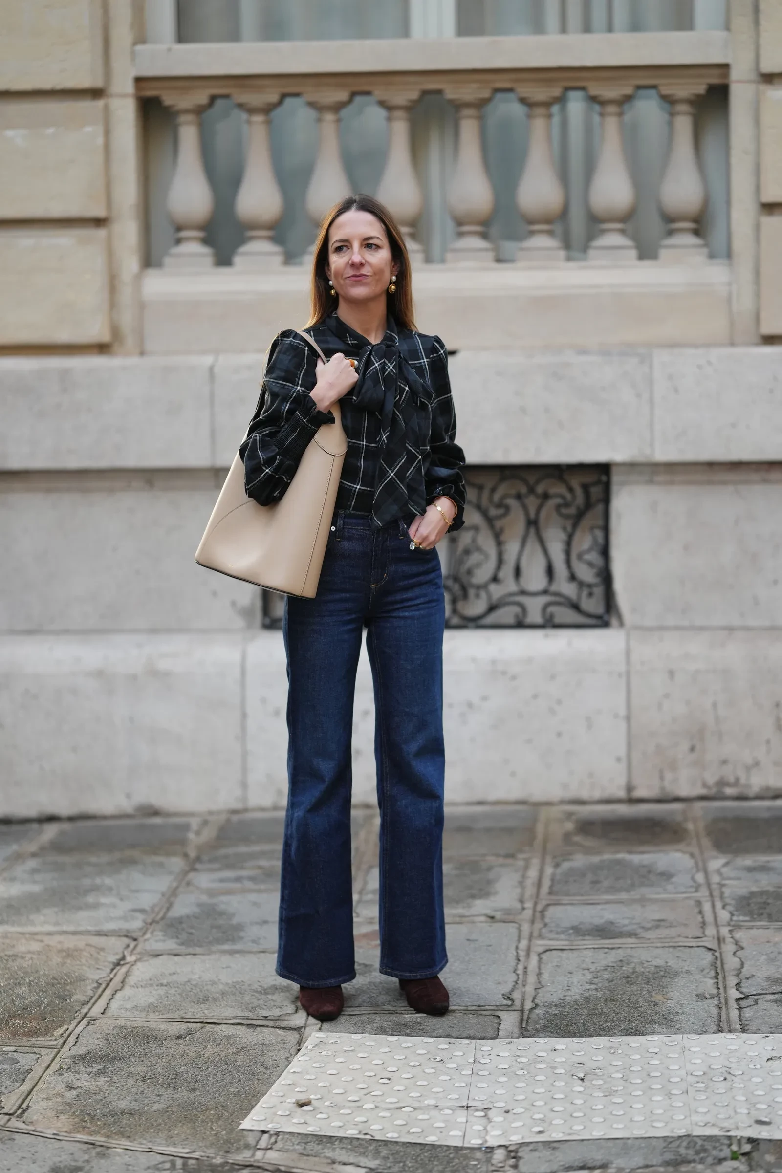 Trong khi đó, phong cách đường phố Paris lại gợi ý một hướng đi thanh lịch hơn: quần jeans cạp thấp phối cùng áo khoác vải tweed, túi tua rua và giày cao gót, tạo nên tổng thể vừa sang trọng vừa thời thượng.