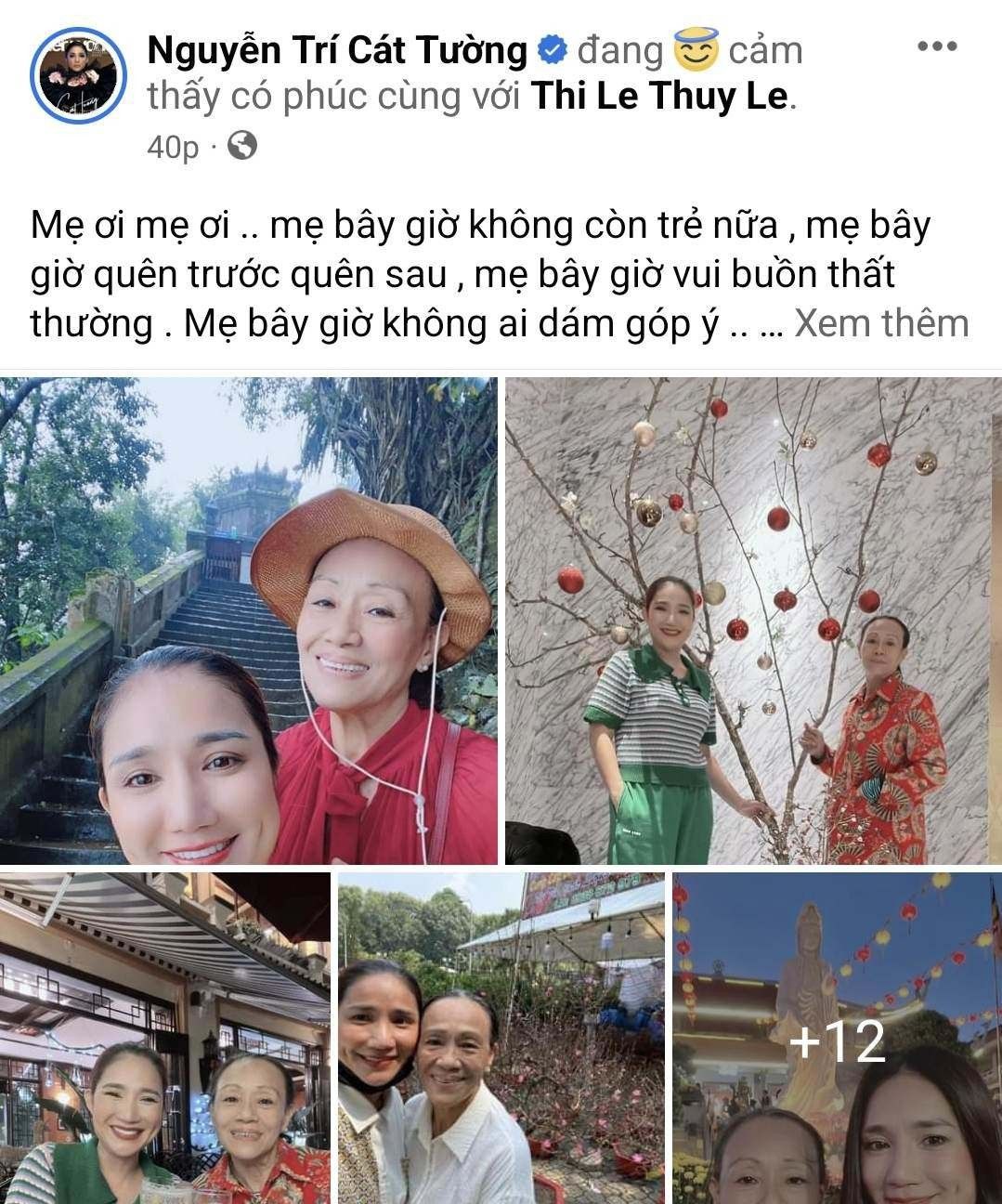 MC Cát Tường chia sẻ: "Mẹ ơi mẹ ơi, mẹ bây giờ không còn trẻ nữa, mẹ bây giờ quên trước quên sau, mẹ bây giờ vui buồn thất thường. Mẹ bây giờ không ai dám góp ý. Mẹ tôi đó. Khó chịu lắm! Nhưng mẹ ơi, con biết mẹ luôn thấy tự hào và hạnh phúc vì có con gái là con. Con biết mẹ vẫn luôn đau buồn và lo lắng cho con - rồi giờ thêm con gái của con nữa...