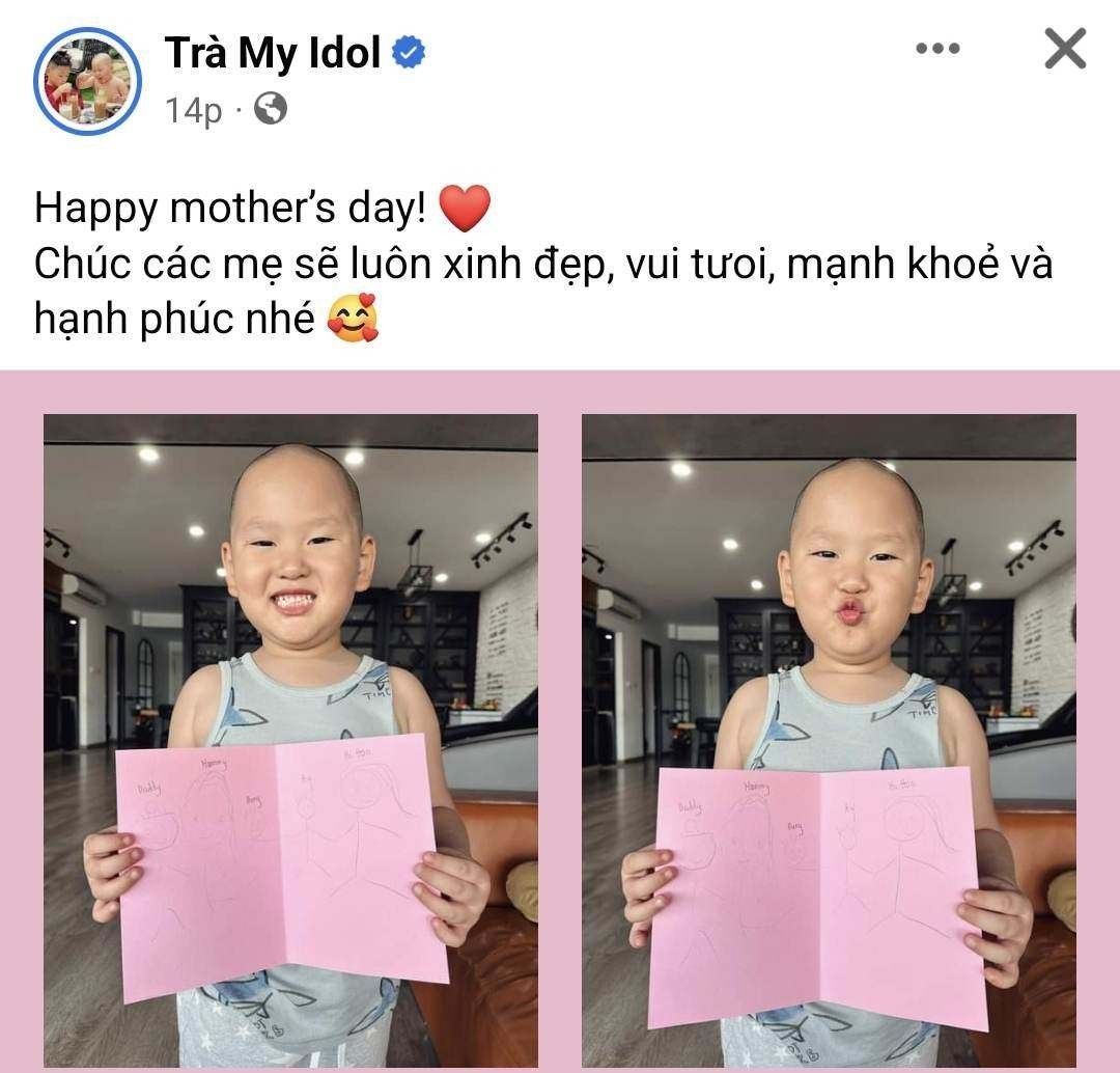 Cũng khoe quà của quý tử, ca sĩ Trà My Idol đăng ảnh được con trai út Hayden Gia Hưng tự tay vẽ thiệp mừng tặng mẹ. Kèm theo đó, Trà My Idol nhắn gửi: "Happy mother’s day! Chúc các mẹ sẽ luôn xinh đẹp, vui tưoi, mạnh khoẻ và hạnh phúc nhé".