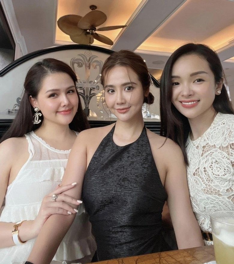 So với hội bạn, Huyền Lizzie dường như chiếm trọn spotlight trong chiếc áo yếm lụa màu đen quyến rũ, khoe làn da trắng mịn.