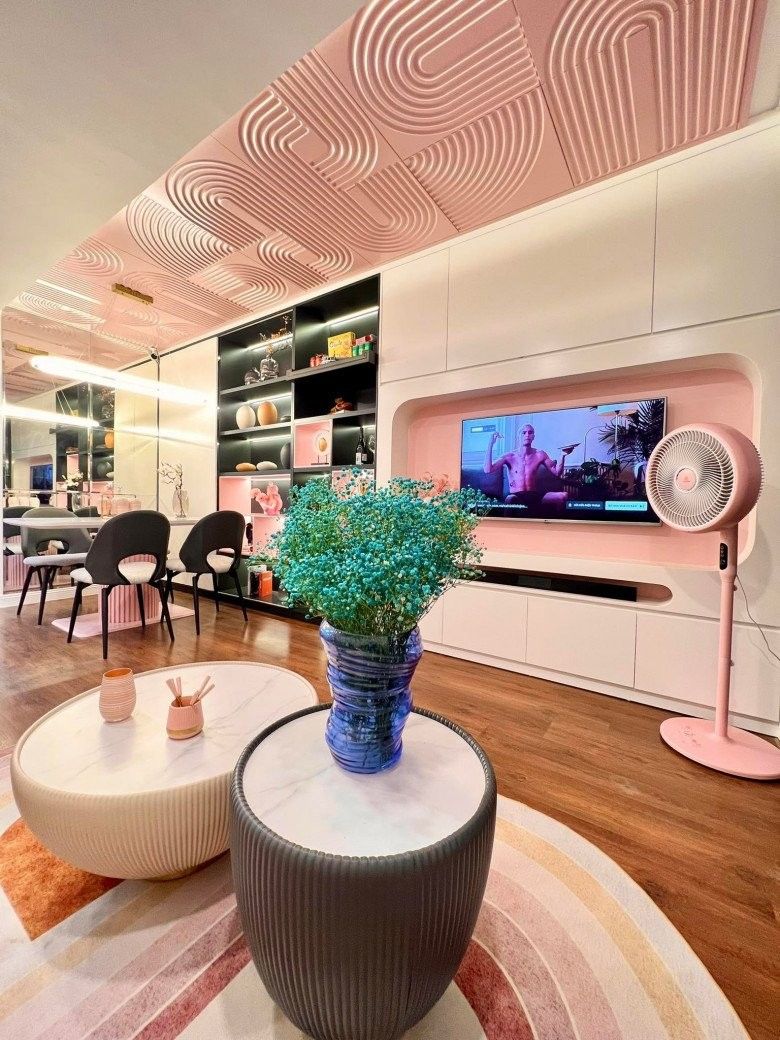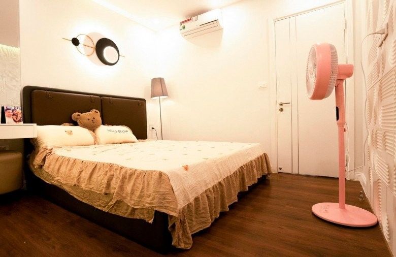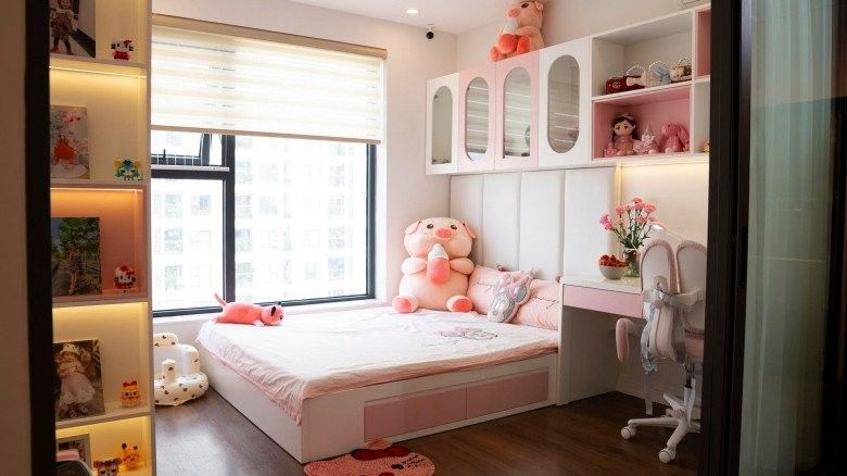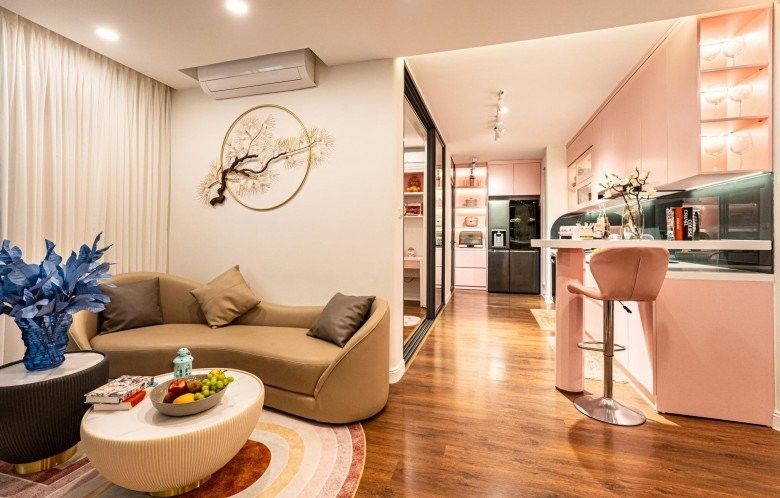 Căn nhà chung cư rộng 75m2, nổi bật với gam màu hồng ngọt ngào và trang trí theo phong cách Hàn Quốc hiện đại. Phòng của 2 cô công chúa có màu trắng - hồng, nhí nhảnh, đáng yêu. Nổi bật nhất vẫn là căn bếp - "trái tim" của ngôi nhà được thiết kế phù hợp với yêu cầu và sở thích của chị Thu Hà.