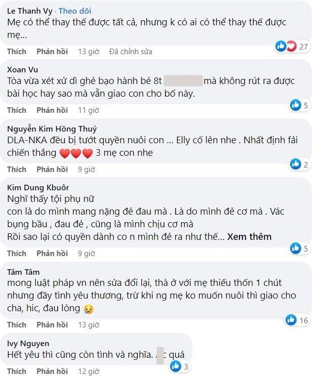 Trên trang cá nhân, bà mẹ đăng tải những dòng cảm xúc khiến ai nấy đều nghẹn ngào. "Nghe tin về Diệp Lâm Anh mình đã khóc không kiềm lại được. Mình hoàn toàn hiểu bạn ấy đang đau đớn tột cùng như thế nào khi phải giao con cho nhà chồng. Thương bé trai nhớ mẹ, nhớ chị. Thương 2 đứa trẻ sinh ra đã có nhau giờ phải chia lìa. Cú sốc này đối với tuổi thơ trẻ con là vết thương không thể nào chữa lành. Phụ nữ cho dù có bị hất hủi cay đắng đến đâu vẫn hơn phải xa cách đứa con mình thai nghén 9 tháng 10 ngày đẻ ra. Thương cho đứa trẻ lúc ốm đau không có mẹ rúc vào lòng để mẹ xoa lưng dỗ dành. Tủi thân biết bao nhiêu. Nỗi đau thống thiết này ai thấu... ".