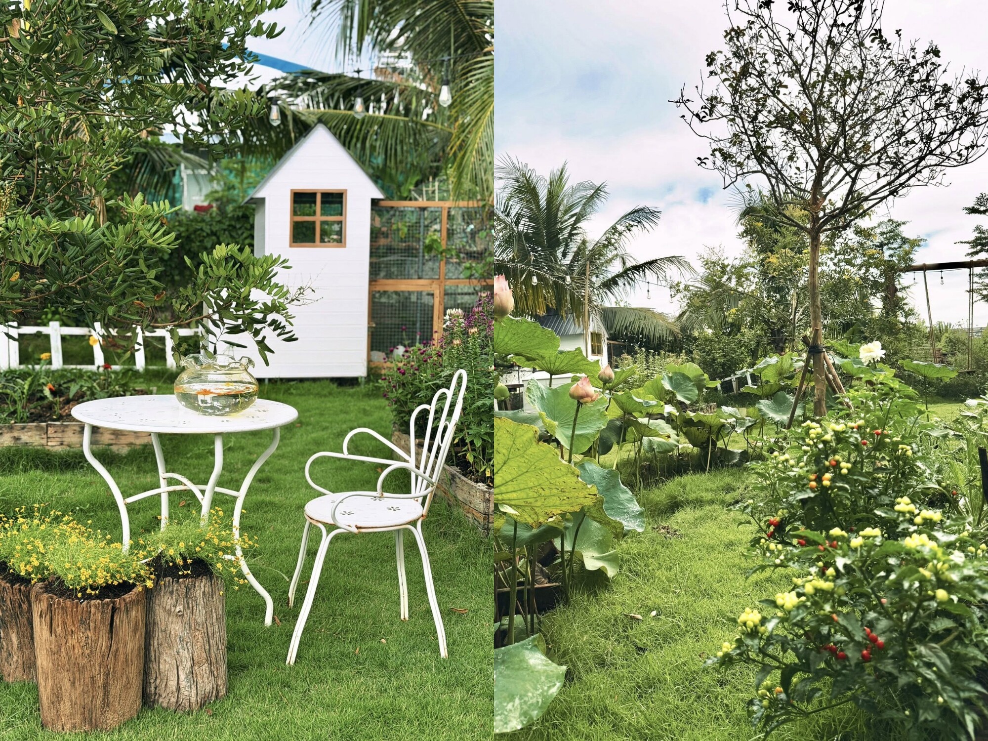 Hiện tại, tổng diện tích khu nhà vườn của gia đình chị Ngọc khoảng 1.000m². Không theo một phong cách thiết kế cụ thể nào, mẹ trẻ làm mọi thứ theo cảm hứng và sở thích cá nhân. Trong vườn, chị trồng đa dạng các loại hoa, rau xanh và một số cây ăn trái, vừa để làm đẹp không gian, vừa phục vụ nhu cầu sinh hoạt hàng ngày.