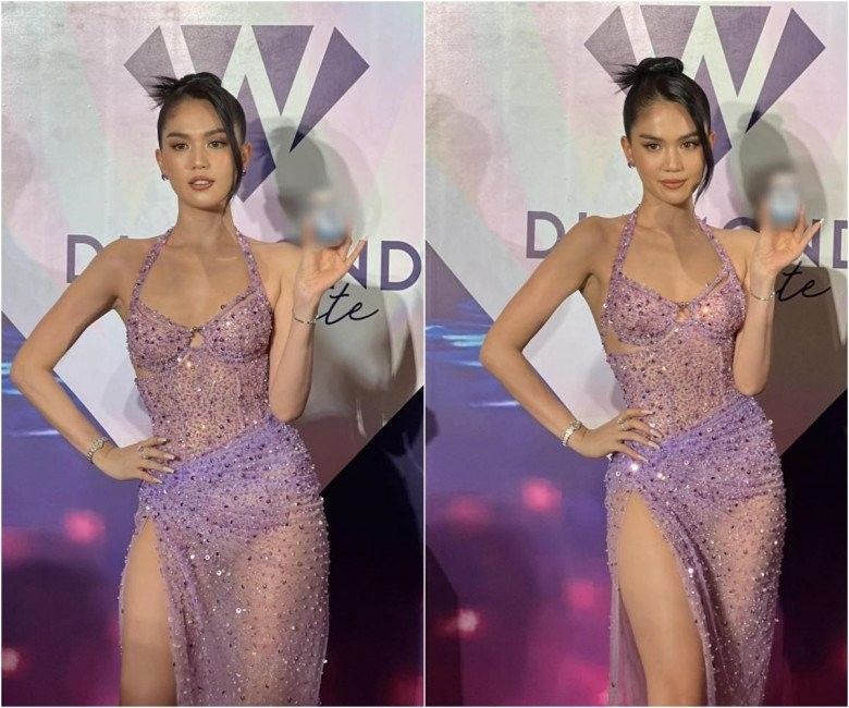 Xuất hiện tại sự kiện, Ngọc Trinh chọn cho mình chiếc đầm đính đá với lớp vải mỏng xuyên thấu. Thiết kế cúp ngực và xẻ tà cao tít tắp giúp cô phô diễn trọn hình thể nóng bỏng không chút mỡ thừa trong ống kính của team qua đường.